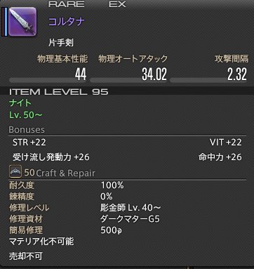 新生FF14だと、STR+22 VIT+22 命中力+26 受け流し発動力+26