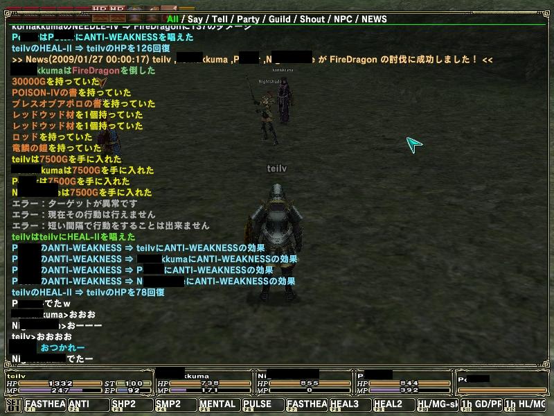 スタンは効かなくなるは、連続して3回ヒールとか何度も来たし、火曜日だというのにやたらとナパーム撃ってくるし……でもまあ、白の人が女神の息吹暴発したり、石化して盾のHPが二桁で死にかけたり、黒の人がめっちゃ殴られて瀕死になったりしたけど無事討伐できて良かった。