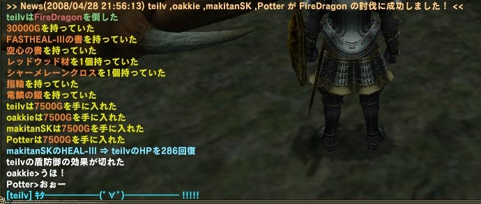 装備の揃ってない、盾にいきなりFD戦の盾は無理だったか…最強のノーキン鎧ゲットしたのはいいが、使う機会があるのやら('A`)