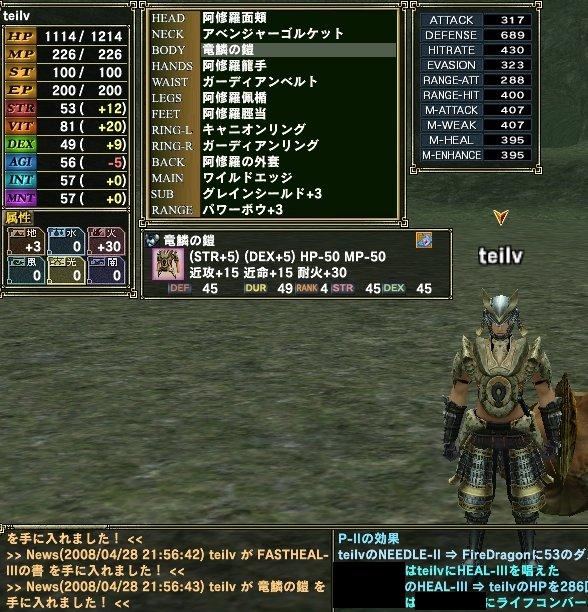 そのかわり、MPが凄い減って、とうとう300切っちゃいましたが…幸いSMP2のおかげでMP切れもおこさなかったし、白の人もヒール負担が少なかったそうなので、盾装備はやっぱり防御特化型がいいみたいですね。