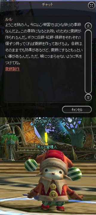 ちなみに、mobから白餅(最大HP+10%)・紅餅(最大MP+10%)・緑餅(AP+1)の効果のある食べ物がドロップするというもの(ただし効果時間10分、ドロップ放置しても消えない)